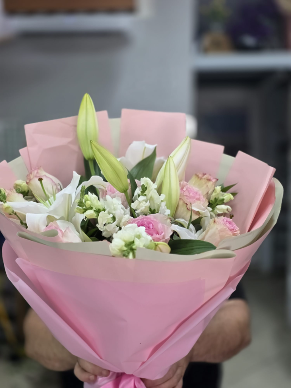 This bouquet, prepared with its elegant stance, is a magnificent combination of naturalness and purity. It is an ideal gift option for special occasions or a sincere smile with its refreshing pink packaging.